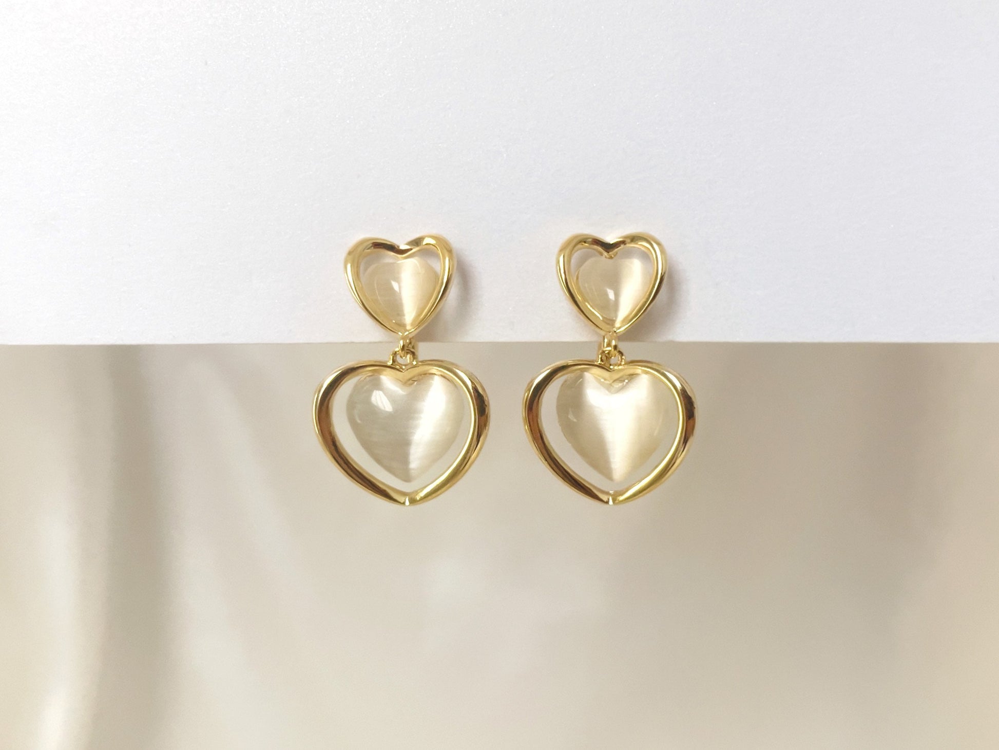 A beautiful pair of gold love heart dangle clip on earrings, these cats eye hearts are very pretty and have a lovely shimmery appearance.