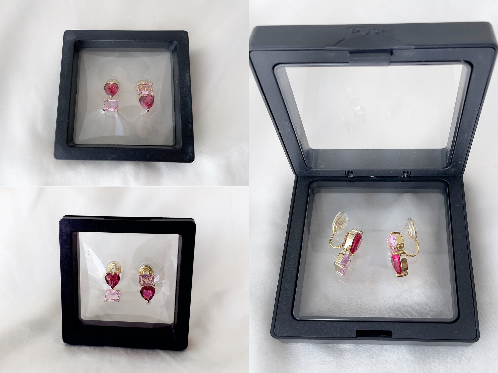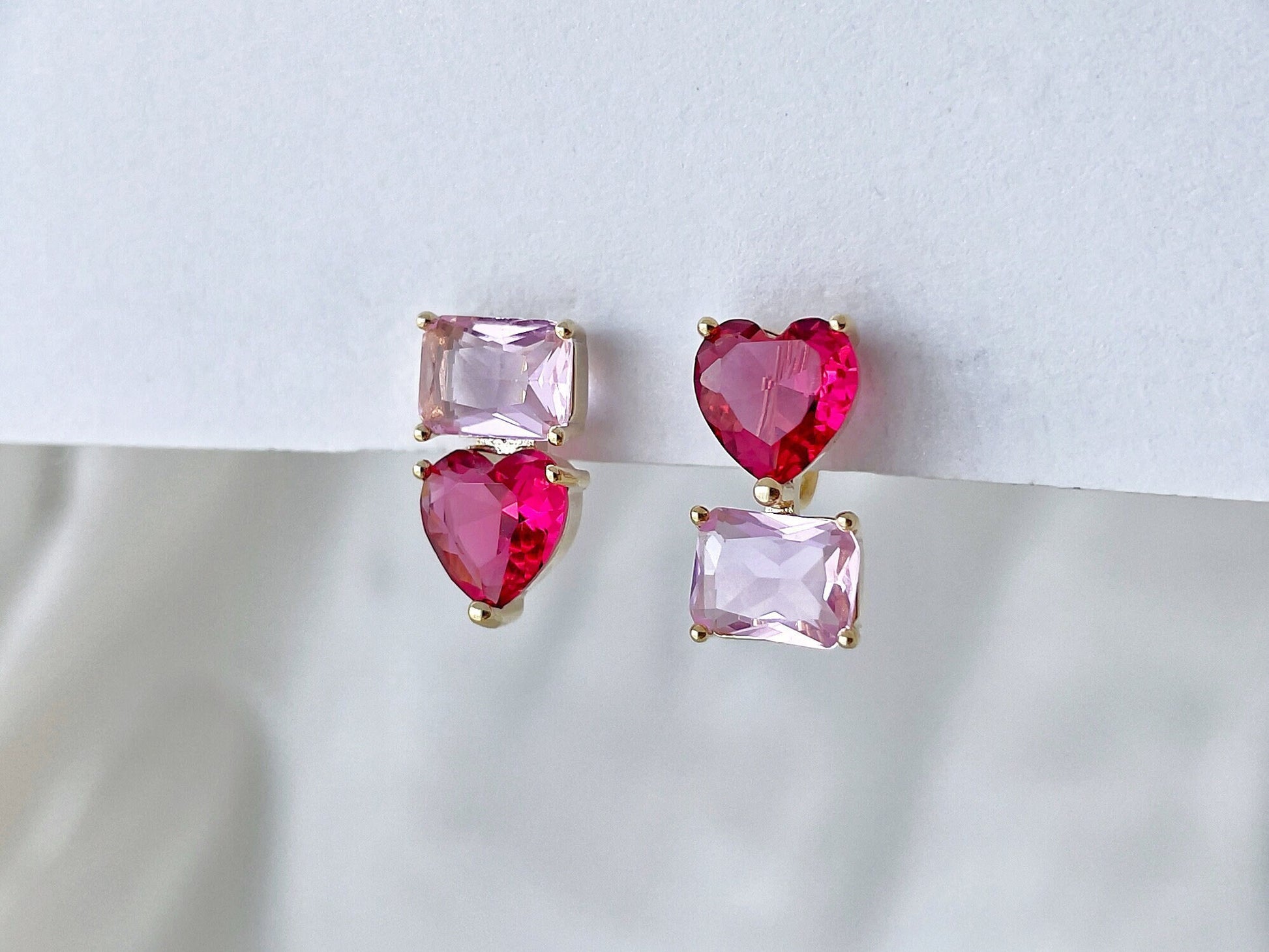 A pair of stunning mismatched pink heart clip on stud earrings, featuring high quality cubic zirconia crystals. Perfect for those who love to mix and match for a unique and stylish statement.