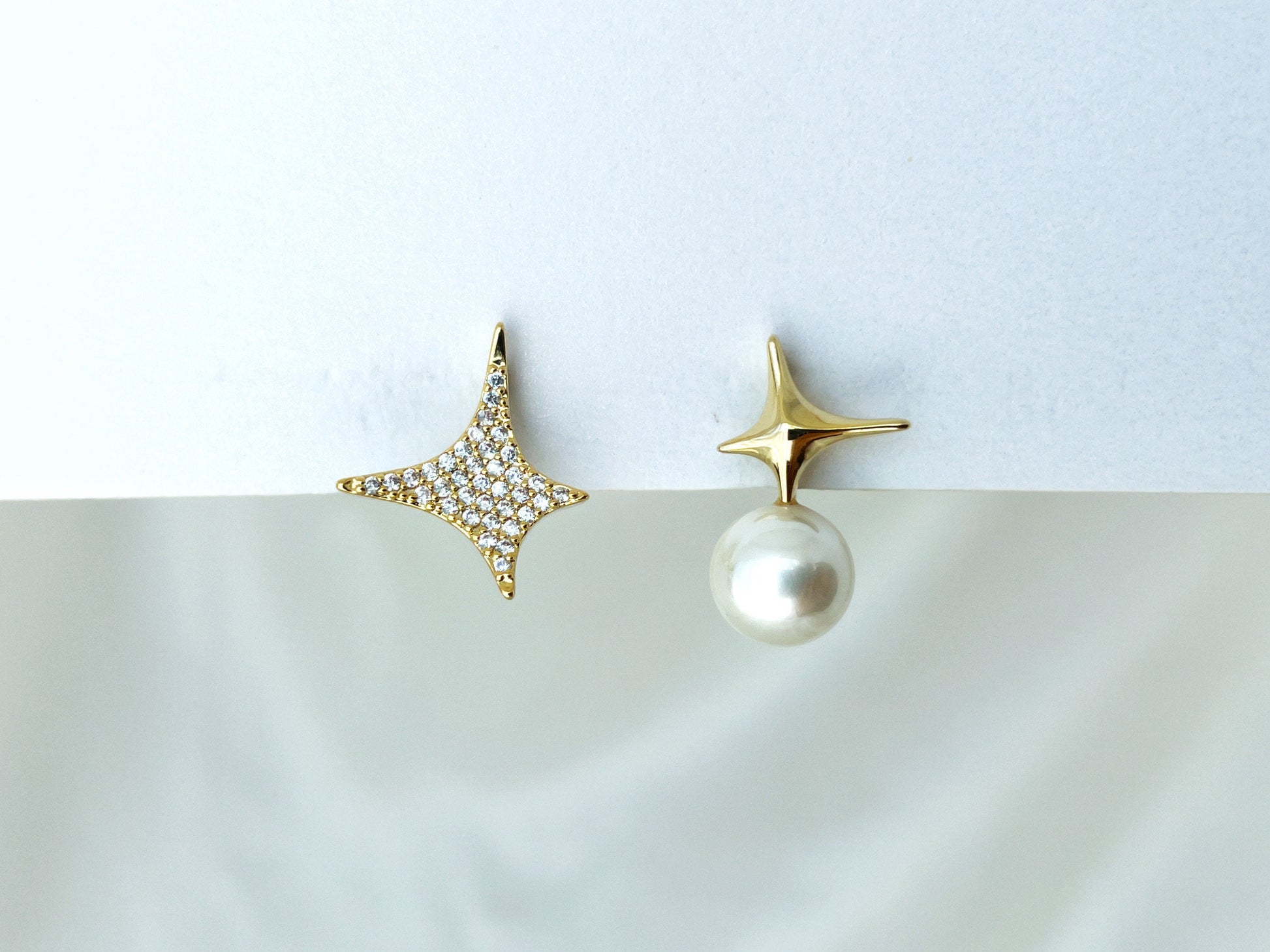 A delicate pair of sparkly celestial clip on earrings, CZ starburst mismatched with a star on pearl, so unique!