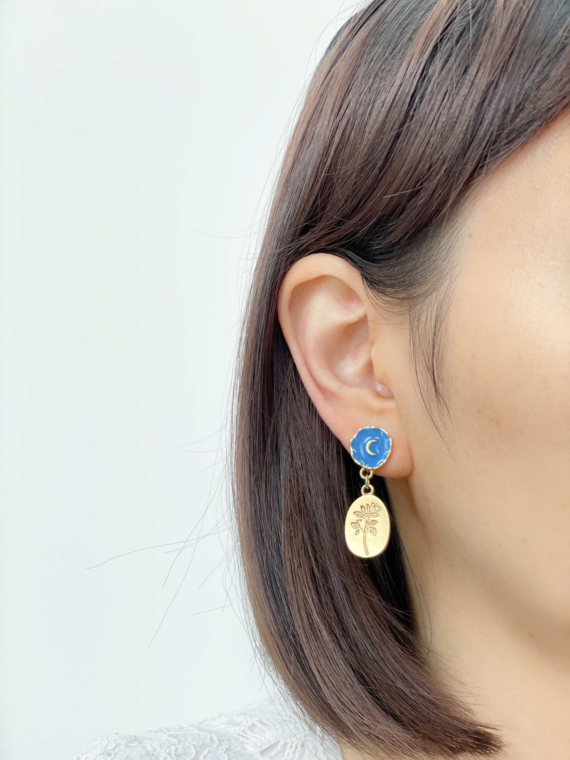 Blue Moon and Gold Coin Rose Dangle Clip on Earrings