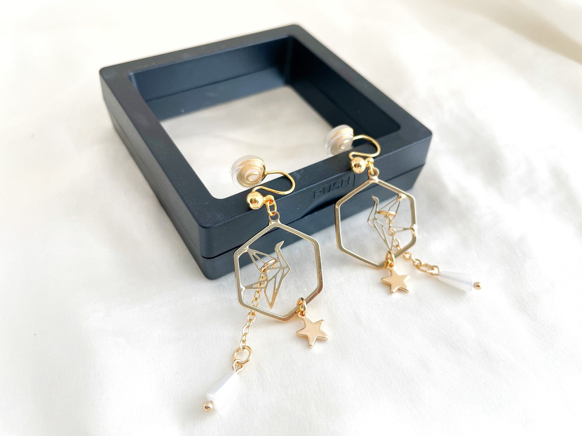 Origami crane on hexagon hoop clip on earrings, with gold star and chain details, drop dangle style.