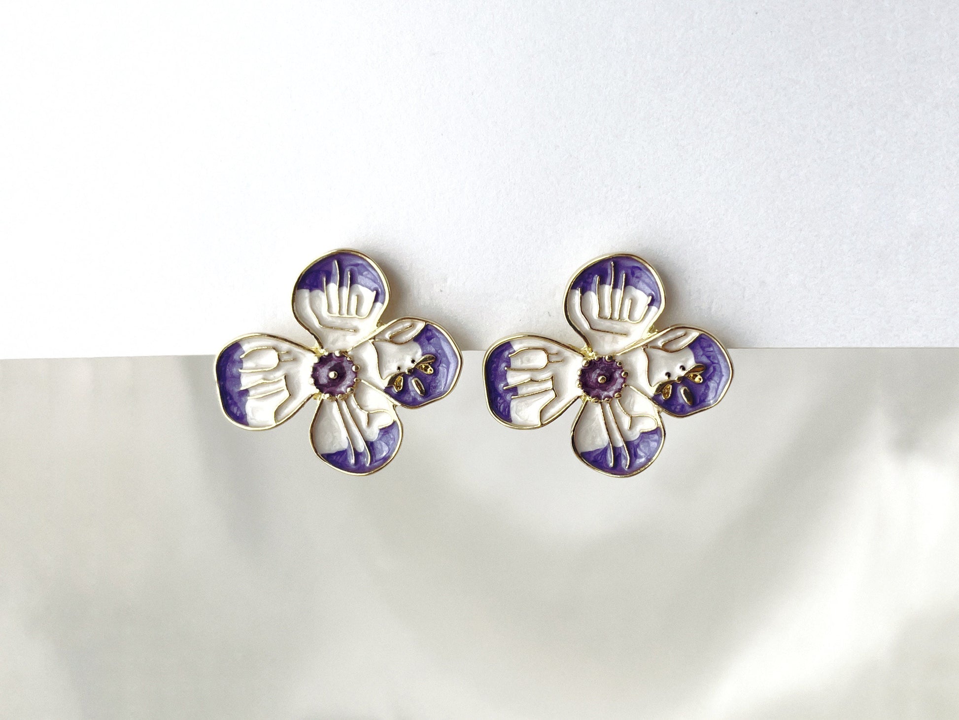 A pair of nature inspired purple and white flower clip on earrings, with enchanting dragonfly details.