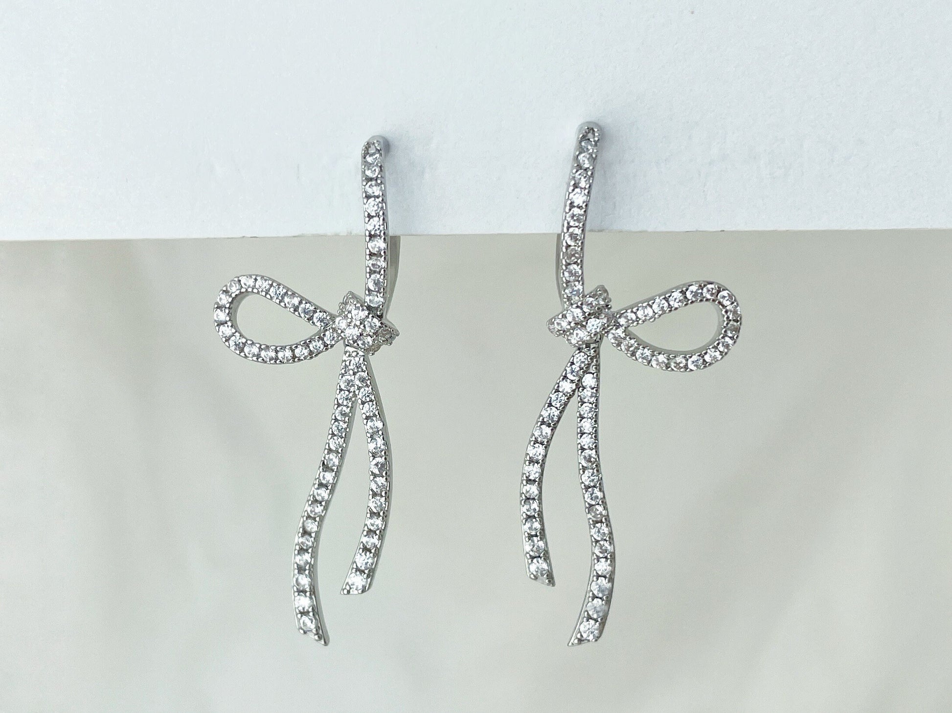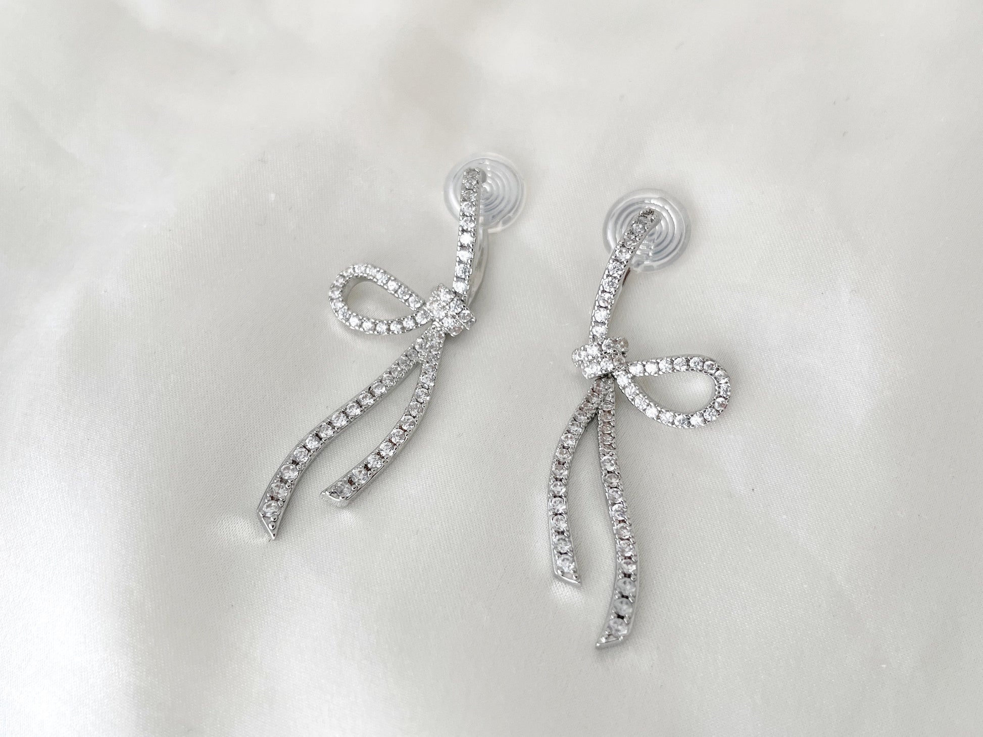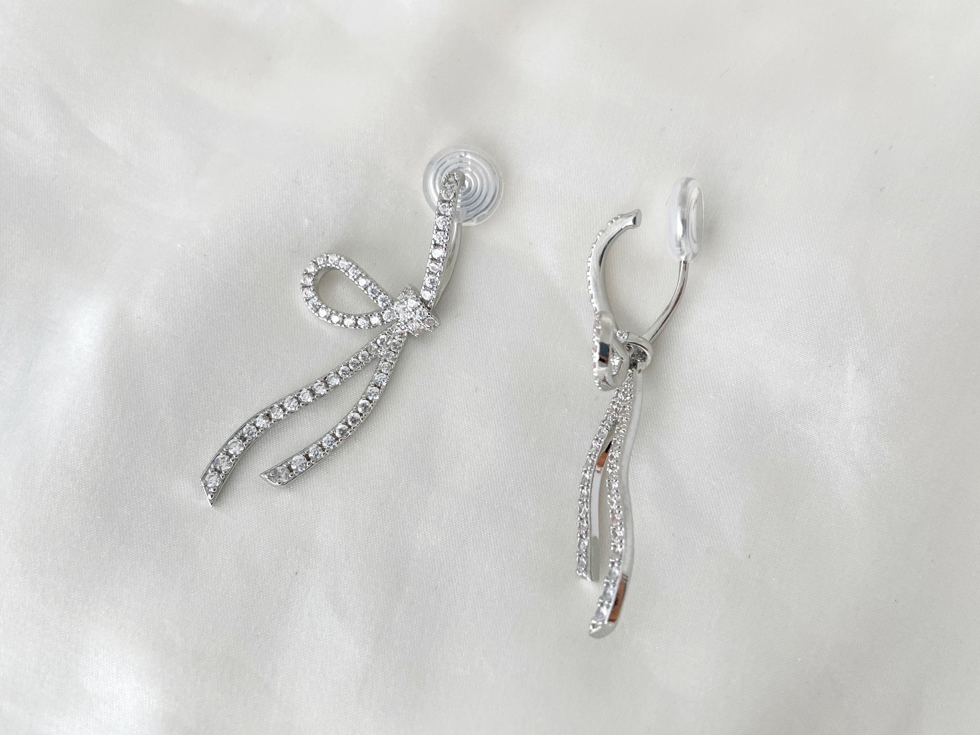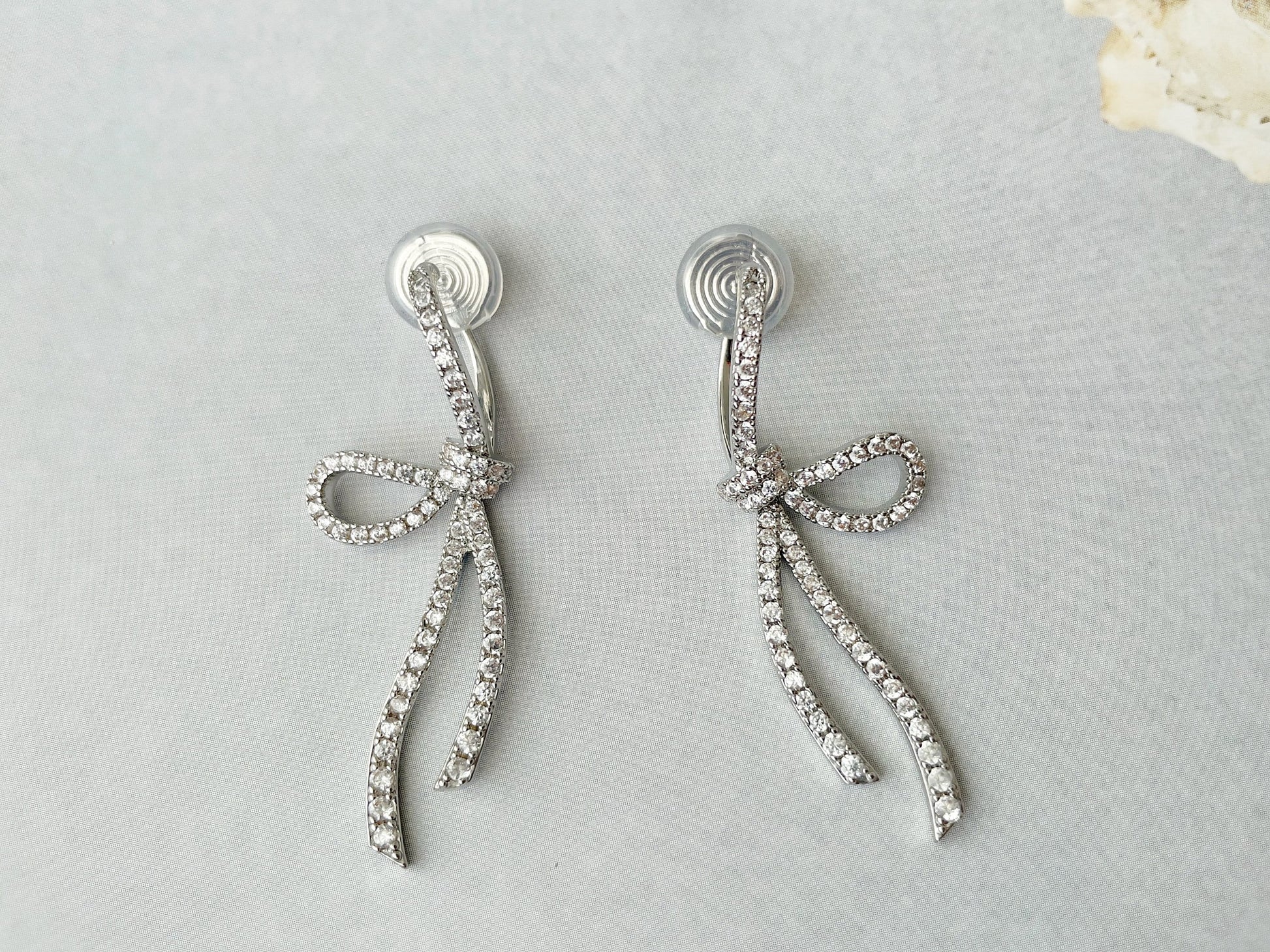 A pair of sparkling CZ crystal silver ribbon bow clip on earrings, featuring dangle dazzling ribbon charm, perfect for adding a touch of glamour to any occasion.