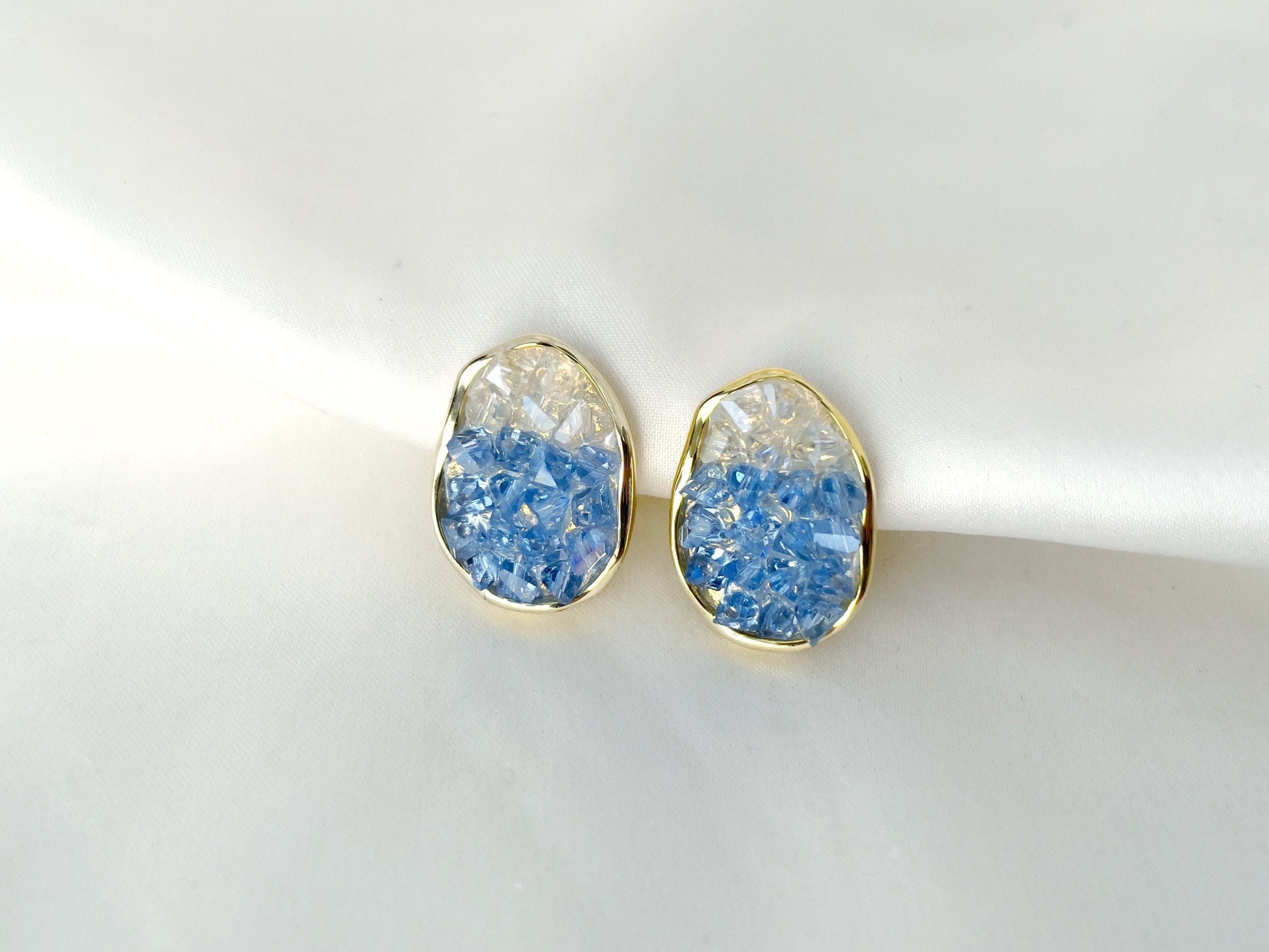 A pair of sparkling druzy crystal glass clip on earrings, adding a touch of glamour and sparkle to your outfit! Available in Blue, Champagne and Green colour.